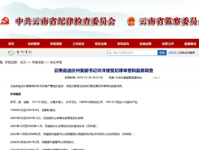 昆明信息港訊 機(jī)器人小明 云南省迪慶州委副書記許洋涉嫌嚴(yán)重違紀(jì)違法,目前正接受云南省紀(jì)委監(jiān)委紀(jì)律審查和監(jiān)察調(diào)查。
