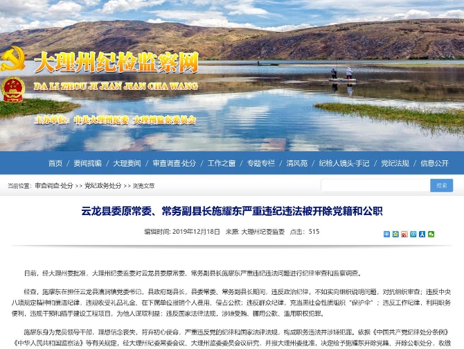 昆明信息港訊 機(jī)器人小明 日前,經(jīng)大理州委批準(zhǔn),大理州紀(jì)委監(jiān)委對(duì)云龍縣委原常委、常務(wù)副縣長(zhǎng)施耀東嚴(yán)重違紀(jì)違法問(wèn)題進(jìn)行紀(jì)律審查和監(jiān)察調(diào)查。