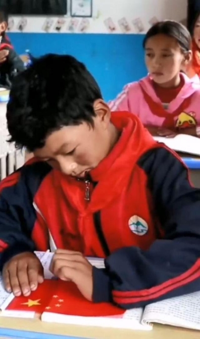他小心翼翼地把國(guó)旗鋪在書(shū)本上