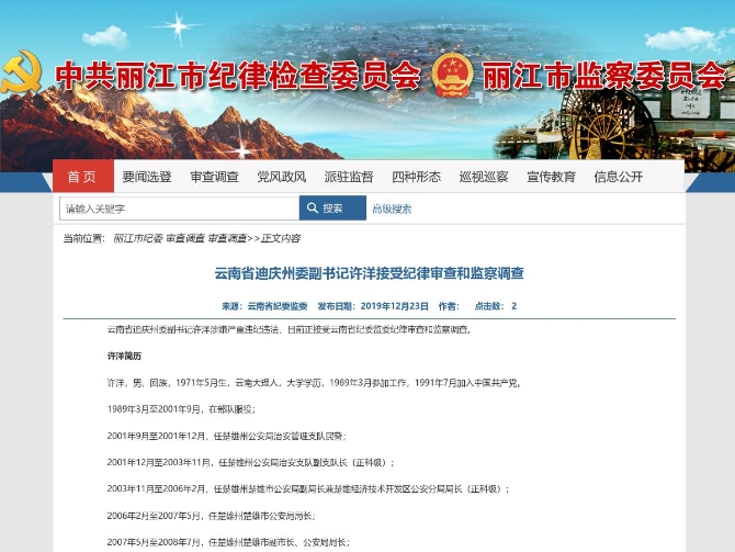 昆明信息港訊 機(jī)器人小明 云南省迪慶州委副書記許洋涉嫌嚴(yán)重違紀(jì)違法,目前正接受云南省紀(jì)委監(jiān)委紀(jì)律審查和監(jiān)察調(diào)查。