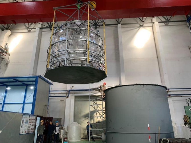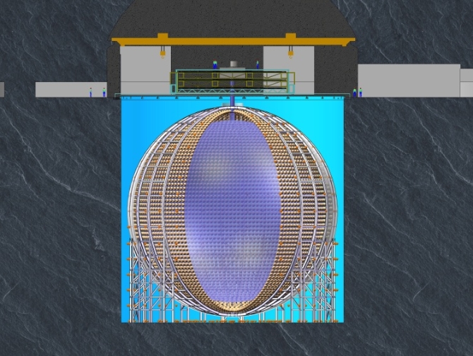 他們將把一個直徑達35.4米的有機玻璃球安裝在廣東省江門市西南部的打石山中。施工人員已經在700多米深的花崗巖下方挖出一個空洞,作為未來的實驗大廳。