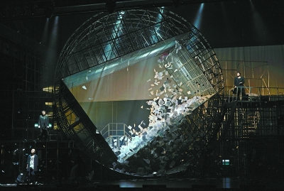 ?舞臺被一個碩大的機械裝置所占據(jù)。你說是轉輪也好,說是巨型的盾構機也罷,或說它是別的什么也無關緊要。與舊帝京時代那個動蕩、衰敗卻也和順安適的老舊茶館不同,孟京輝和舞美設計師張武所共同呈現(xiàn)的舞臺景觀,是一個現(xiàn)代/后現(xiàn)代的機械/影像世界。在這里,漢堡包代替爛肉面,手槍代替(上吊用的)褲腰帶,RAP代替快板書,機械裝置驅動的轟響代替鴿哨和此起彼伏的街聲……這個世界同樣有許許多多故事:康順子嫁作太監(jiān)妻的凄苦的身世,小丁寶對浪漫愛情的渴望,常四爺與松二爺對世道變遷的慨嘆……然而在這個巨輪轉動的世界里,這一切都只不過是些破碎的故事或故事的碎片。在巨輪轉動、紙片紛飛中,不是他們給時代送葬,而是時代將他們埋葬。