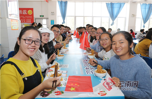 午飯時(shí)間,在云南各大高校里,食堂里早早就為師生們備好了“國(guó)慶面”,大家圍坐在一起,吃一碗“國(guó)慶面”,共同為新中國(guó)慶祝生日。