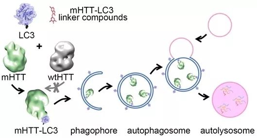 ATTEC靶向降解mHTT蛋白示意圖。圖片來源:魯伯塤等