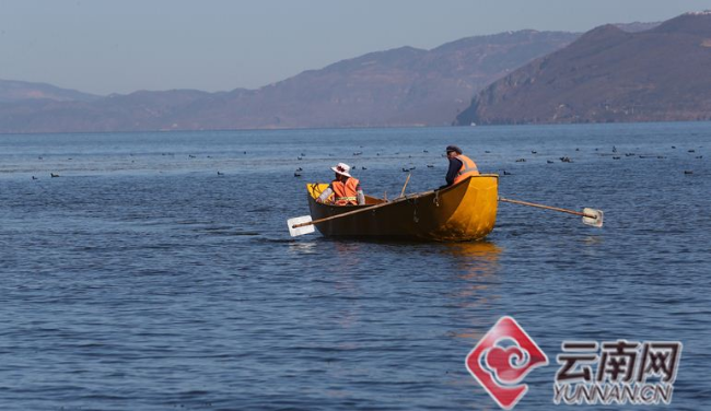 ?沿湖巡查的洱海保潔船和保潔員。記者 楊崢 攝