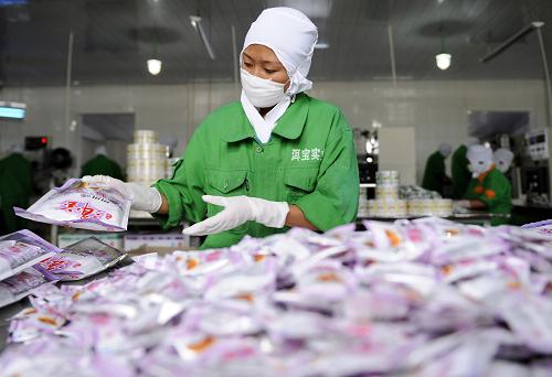 工作人員在云南省大理白族自治州洱源縣洱寶話梅廠內(nèi)包裝酸角糕和青梅糕。新華社記者 戴旭明 攝