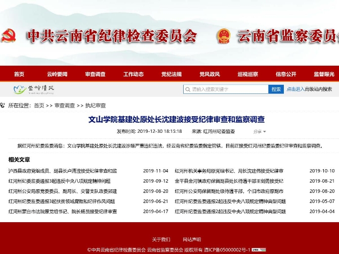 昆明信息港訊 12月30日,據(jù)紅河州紀委監(jiān)委消息,文山學(xué)院基建處原處長沈建波涉嫌嚴重違紀違法,經(jīng)云南省紀委監(jiān)委指定管轄,目前正接受紅河州紀委監(jiān)委紀律審查和監(jiān)察調(diào)查。