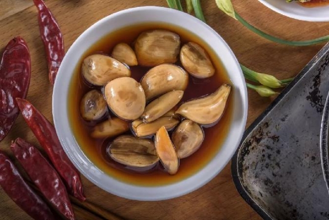 將紫皮蒜浸入米醋