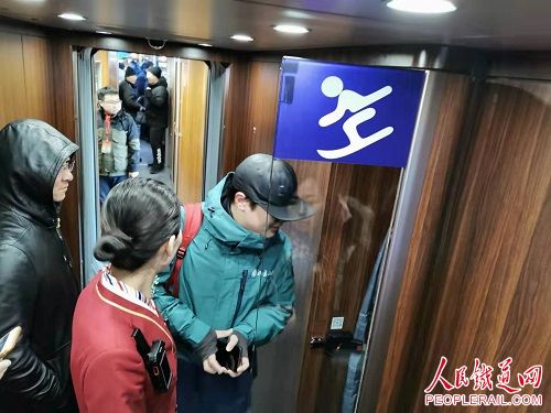 △列車上,工作人員在為滑雪愛好者講解滑雪設(shè)備存放區(qū)的使用方法。