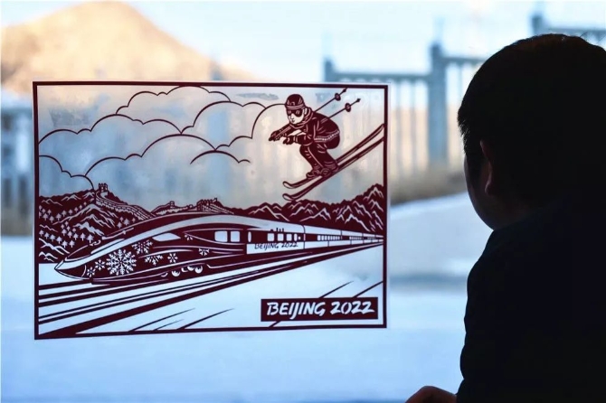 △2019年12月30日,北京北站開往太子城站的G8811次列車車窗上貼著2022年北京冬奧會主題剪紙 彭子洋 攝