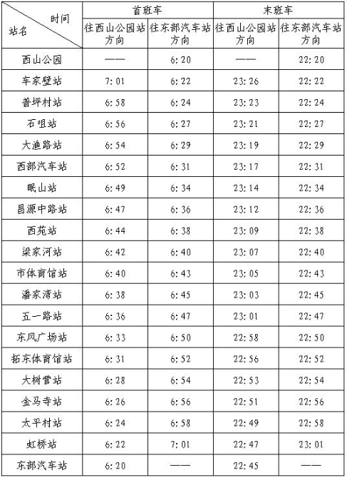 1、2號(hào)線首期工程首末班車時(shí)刻表