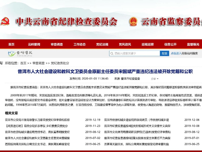 昆明信息港訊 機(jī)器人小明 據(jù)普洱市紀(jì)委監(jiān)委消息:普洱市人大社會(huì)建設(shè)和教科文衛(wèi)委員會(huì)原副主任委員宋國(guó)斌嚴(yán)重違紀(jì)違法被開(kāi)除黨籍和公職,其涉嫌犯罪問(wèn)題移送檢察機(jī)關(guān)依法審查起訴。