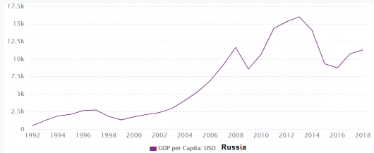 圖為1992-2018年俄羅斯以美元計人均GDP