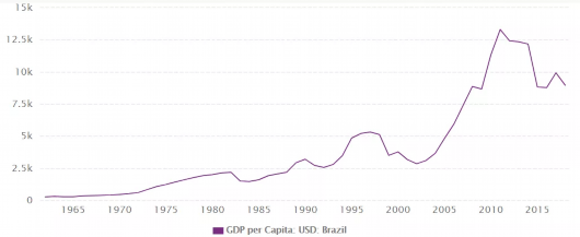 圖為1962-2018巴西以美元計人均GDP