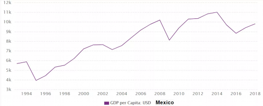 圖為1993-2018年墨西哥以美元計人均GDP