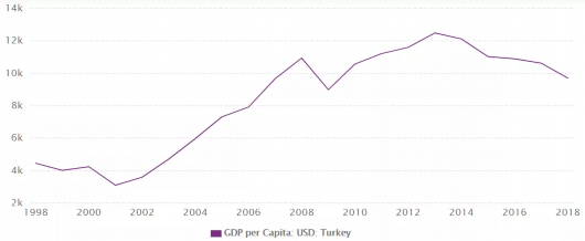 圖為1998-2018年土耳其以美元計人均GDP