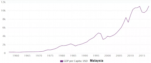 圖為1957-2018年馬來西亞以美元計人均GDP