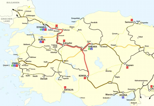 圖為土耳其高鐵線路圖(紅線為主干,黃色為計劃的支線,五個標(biāo)U的是有地鐵的城市)