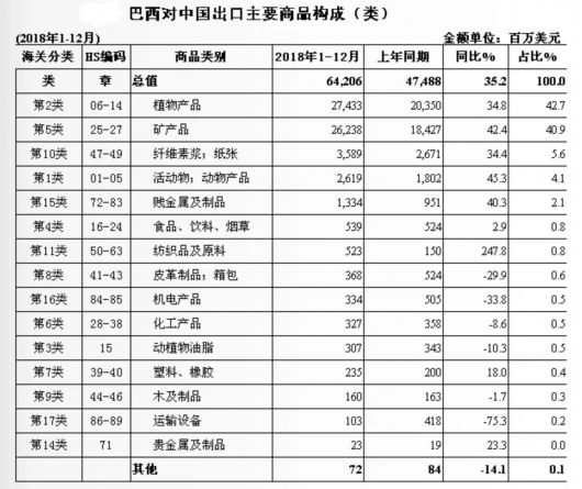 圖為2018年巴西對中國出口主要商品構(gòu)成