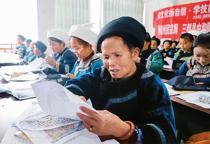 ?貴州省黔南布依族苗族自治州三都水族自治縣中和鎮(zhèn)紅星村開(kāi)辦理論培訓(xùn)和實(shí)用技能培訓(xùn)“雙培”課堂,促進(jìn)水族同胞就業(yè)增收。圖為2019年11月17日,100余名水族同胞在“傳文化揚(yáng)自信,學(xué)技能奔小康”“雙培”課堂學(xué)習(xí)水族剪紙技藝。 中新社記者 瞿宏倫/攝