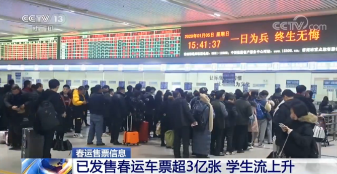 昨天(5日)鐵路互聯(lián)網(wǎng)和電話售票開始發(fā)售春運第25天,也就是2月3日(正月初十)的火車票。春運首日車票開始發(fā)售至今,全國鐵路已經(jīng)發(fā)售春運期間車票3億多張。隨著各地大學(xué)生陸續(xù)放假,學(xué)生客流也開始上升。