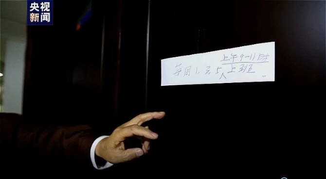 他為了怕來(lái)這找他的人到這里找不到他,因?yàn)檫@樓里的人也少了。他就貼了個(gè)條,說(shuō)每周一、三、五上午九點(diǎn)到十一點(diǎn)上班。來(lái)看他的人一看就知道,還有搞衛(wèi)生和保潔的人,不用給他倒開水了。他自己寫的這個(gè)條。