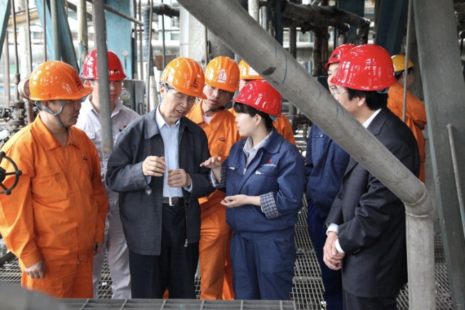 ▲陳俊武院士在陜西華縣DMTO工業(yè)試驗(yàn)項(xiàng)目現(xiàn)場(chǎng)聽取裝置試車情況匯報(bào)