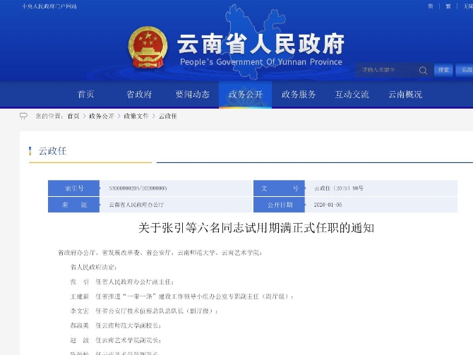 昆明信息港訊 機器人小明 1月5日,云南省人民政府發(fā)布一則任職通知,具體內(nèi)容如下: