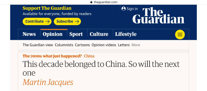 近日,以嚴(yán)肅獨(dú)立著稱的英國三大報(bào)之一的《衛(wèi)報(bào)》在其官網(wǎng)刊發(fā)了英國劍橋大學(xué)高級研究員馬丁·雅克(Martin Jacques)的文章:《過去十年屬于中國,未來十年也將如此》(This decade belonged to China. So will the next one)。文章指出,在過去十年里,全球經(jīng)濟(jì)增長的主要源泉一直是中國而非美國。同樣未來十年,中國在全球的影響力將與日俱增。