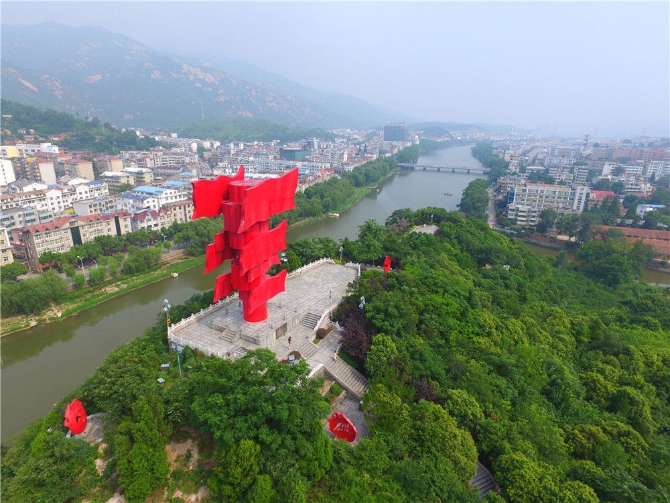 這是河南省信陽(yáng)市新縣鄂豫皖蘇區(qū)首府革命博物館附近的英雄山八面紅旗雕塑(2017年8月4日無(wú)人機(jī)照片)。新華社記者 馮大鵬 攝