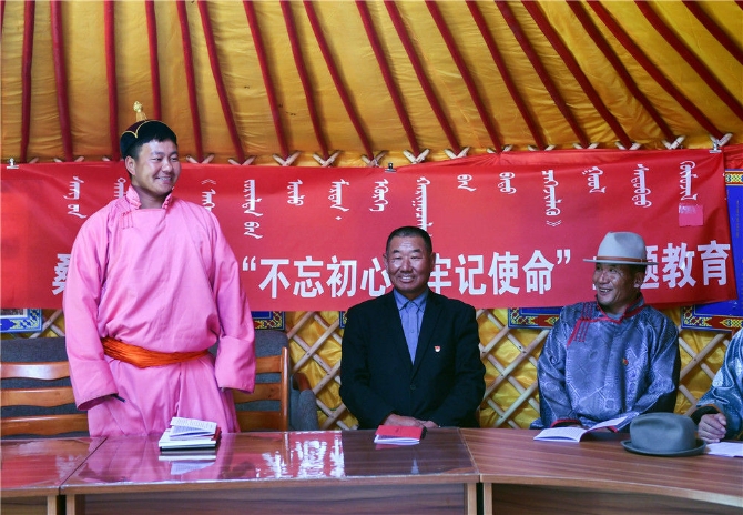 2019年10月11日,在內(nèi)蒙古自治區(qū)正藍(lán)旗恩克寶力格嘎查黨員中心戶(hù)的蒙古包中,黨員敖日格勒(左一)在回答知識(shí)競(jìng)賽問(wèn)題。新華社記者 劉磊 攝