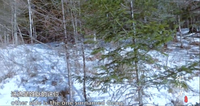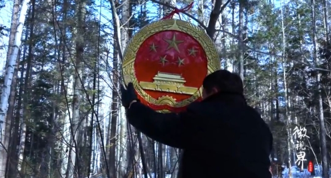 樹(shù)林中掛起國(guó)徽由于雙方爭(zhēng)執(zhí)的紅松果林界線(xiàn)在山上,越野車(chē)無(wú)法駛進(jìn)去,張祖祥一行人只能下車(chē)爬山。山里人跡罕至,積雪無(wú)人清理,早已完全把山路覆蓋住,一腳踩下去,白雪沒(méi)過(guò)小腿的一半。經(jīng)過(guò)艱難的行走,張祖祥一行人到了爭(zhēng)議地。