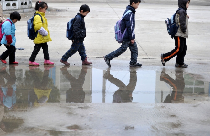 俊俊(右二)和小伙伴們走在上學(xué)的路上(2011年11月30日攝)。這些年來,陪在俊俊身邊的還有4名形影不離的小伙伴,他們跟俊俊一樣經(jīng)母嬰傳播感染了艾滋病毒,最后因?yàn)楦改鸽x世或被父母遺棄而成為孤兒。