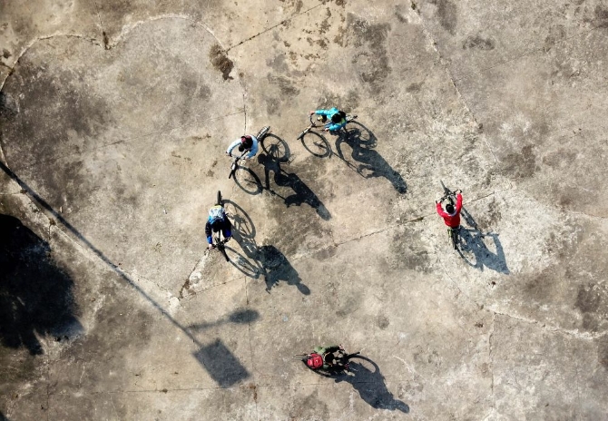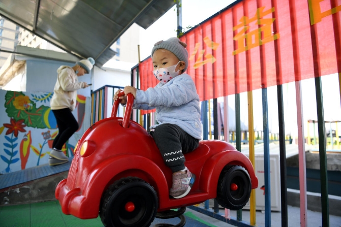 俊俊(左一)和小伙伴們騎單車在小區(qū)公園內(nèi)追逐玩耍(2017年11月26日攝)。