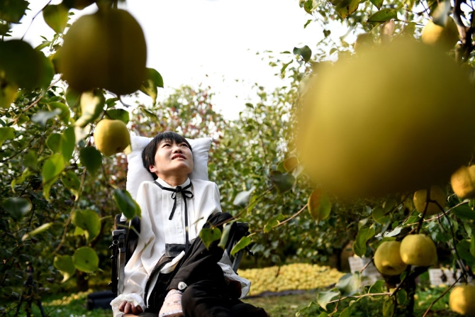 10月份正值碭山酥梨采摘的季節(jié),李娟的父母起早貪黑在梨園里忙著采摘。采訪那天,天氣晴朗,李娟在弟妹的幫助下來到了自家的梨園,看到豐收的場(chǎng)景,想到小時(shí)候在梨樹下與姐妹一起嬉戲的時(shí)光,李娟開心得像個(gè)孩子。在梨園里,我爬上爬下,換著各種角度,只想把李娟和她家人的勞動(dòng)之美和大地的豐收之美記錄下來,希望把她們的美傳遞給每一位讀者。