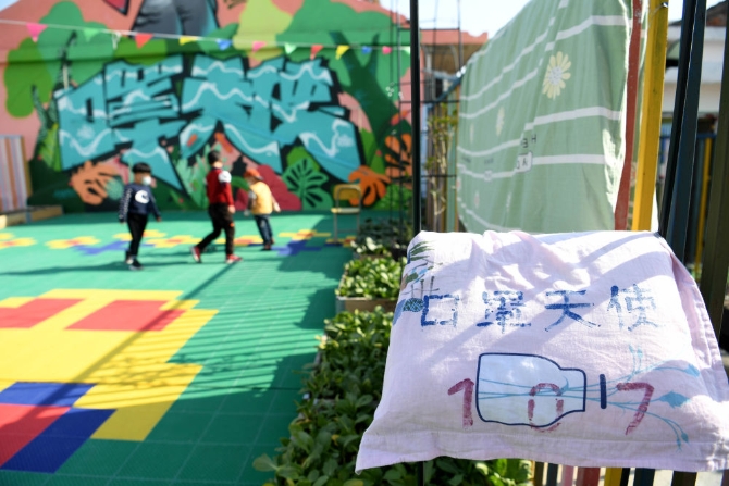 三名小朋友在“中途宿舍”房頂?shù)幕顒?dòng)區(qū)玩耍。