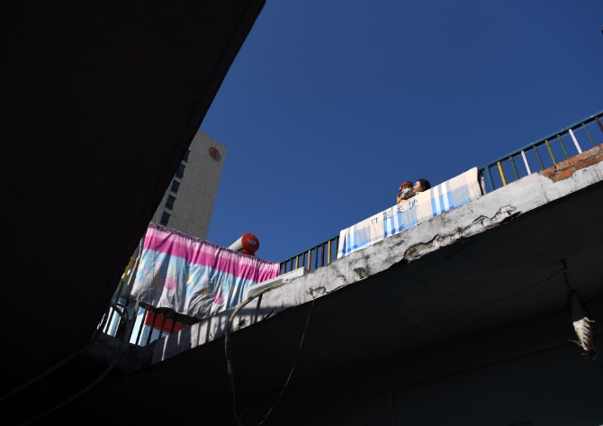 一名患兒和家長在“中途宿舍“房頂?shù)幕顒?dòng)區(qū)曬太陽。