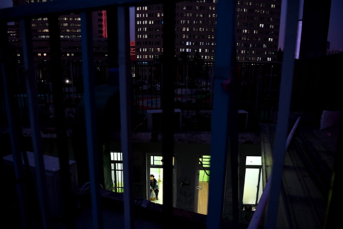 一名小朋友在“中途宿舍”房頂?shù)幕顒?dòng)區(qū)玩耍。