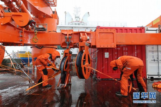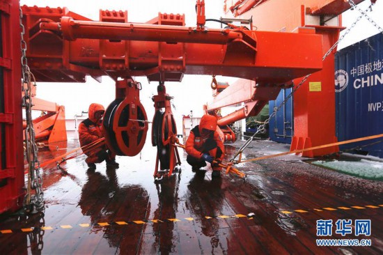 1月9日,“雪龍2”號隊員在綁扎科考設備。新華社記者劉詩平/攝