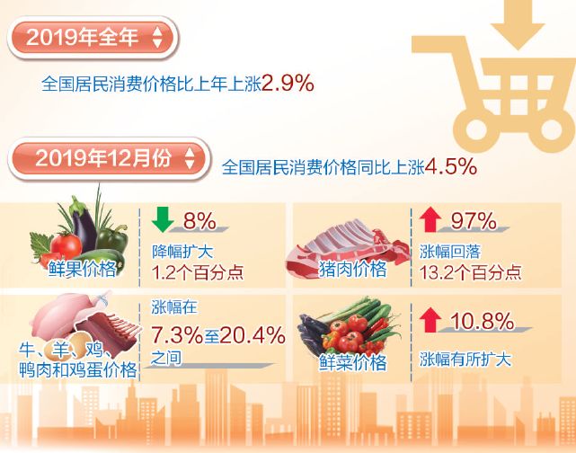 2019年,受部分食品價(jià)格結(jié)構(gòu)性上漲影響,CPI同比漲幅由年初1.5%逐月走高,11月份和12月份漲幅均為4.5%。不過,CPI全年同比漲幅為2.9%,符合全年CPI同比漲幅3%左右的調(diào)控目標(biāo)。