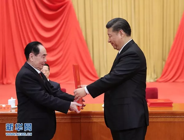 習(xí)近平向獲得2018年度國家最高科學(xué)技術(shù)獎的中國人民解放軍陸軍工程大學(xué)錢七虎院士頒發(fā)獎?wù)隆P氯A社記者 謝環(huán)馳 攝
