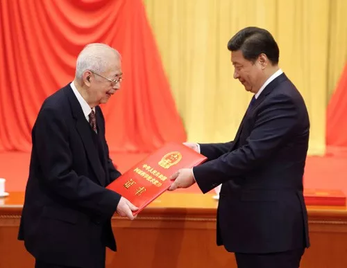 習(xí)近平向獲得2013年度國家最高科學(xué)技術(shù)獎的中國科學(xué)院院士程開甲頒獎。