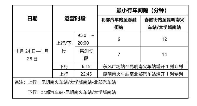 4.1月31日—2月9日期間,晚高峰延長至22:30,22點45分至23點30分加開3列次昆明南火車站至北部汽車站方向的列車。(云報客戶端 記者龍舟)