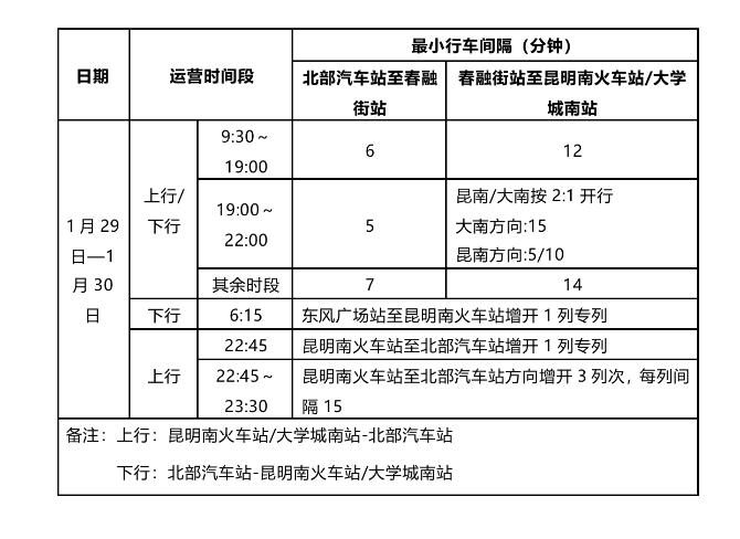 1.1月19日(星期天)需要補班一天,昆明地鐵將使用工作日運行圖。