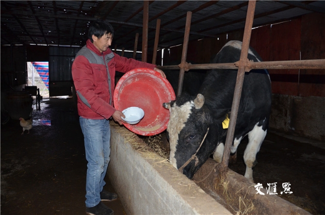 看張其全喂牛還真讓人有種享受感,整個喂牛過程一絲不茍,一點不馬虎。先給每頭牛喂一小把草料?!芭3圆?,但不是吃得越多越好,吃多了會出現(xiàn)氣脹。”隨后,他開始配制混合飼料,鏟些酒糟放進兩口缸內(nèi),并加入麥麩、小蘇打、鹽、水等,攪拌幾分鐘,便做好了,一桶一桶地倒到每頭牛的槽子中,“小牛兩桶左右,大牛三至四桶,每天兩頓,早上7點,下午3點?!币苍S是張其全做的這種食物太美味,牛吃著還不時用舌頭舔著唇,似乎在表達贊許。等牛差不多享用完這些美食了,張其全又用塑料桶端來顆粒飼料,每頭牛跟前一小鏟,“顆粒飼料也不能吃多,吃多了食脹,所以喂牛的各種飼料都必須定量,否則就可能生病”。