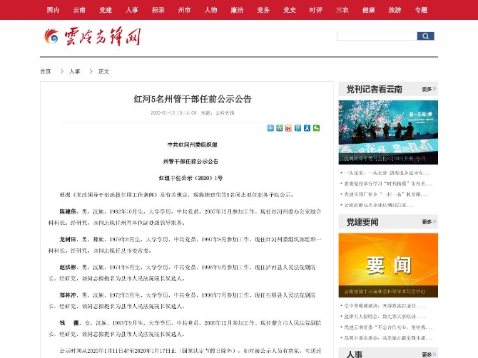 昆明信息港訊 機器人小明 1月10日,中共紅河州委組織部發(fā)布州管干部任前公示公告。陳建偉擬任州直單位副處級領(lǐng)導職務,龍樹田擬任縣市委常委。詳細如下: