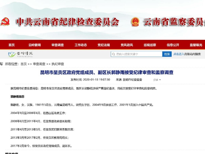 昆明信息港訊 機(jī)器人小明 據(jù)昆明市紀(jì)委監(jiān)委消息:昆明市呈貢區(qū)政府黨組成員、副區(qū)長郭靜雨涉嫌嚴(yán)重違紀(jì)違法,目前正接受紀(jì)律審查和監(jiān)察調(diào)查。