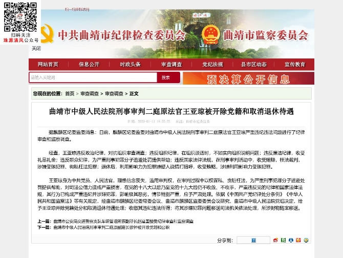 王亞瓊身為中共黨員、人民法官,理想信念喪失,濫用審判權(quán),在審判過程中以權(quán)謀私、貪贓枉法,為嚴(yán)重刑事犯罪分子逃避處罰提供幫助,對司法公信力造成嚴(yán)重?fù)p害,在黨的十八大以后乃至黨的十九大后仍不收斂、不收手,嚴(yán)重違反黨的紀(jì)律和國家法律法規(guī),其行為已構(gòu)成嚴(yán)重違紀(jì)并涉嫌犯罪,影響極其惡劣,情節(jié)特別嚴(yán)重,應(yīng)予嚴(yán)肅處理。依據(jù)《中國共產(chǎn)黨紀(jì)律處分條例》《中華人民共和國監(jiān)察法》等有關(guān)規(guī)定,經(jīng)曲靖市麒麟?yún)^(qū)紀(jì)委常委會議、曲靖市麒麟?yún)^(qū)監(jiān)委委員會議研究,曲靖市中級人民法院黨組決定,給予王亞瓊開除黨籍處分和取消退休待遇處理;收繳其違紀(jì)違法所得;將其涉嫌犯罪問題移送司法機(jī)關(guān)依法處理,所涉財物隨案移送。(本文由昆明信息港寫稿機(jī)器人小明根據(jù)曲靖市紀(jì)委網(wǎng)站數(shù)據(jù)自動合成發(fā)布)