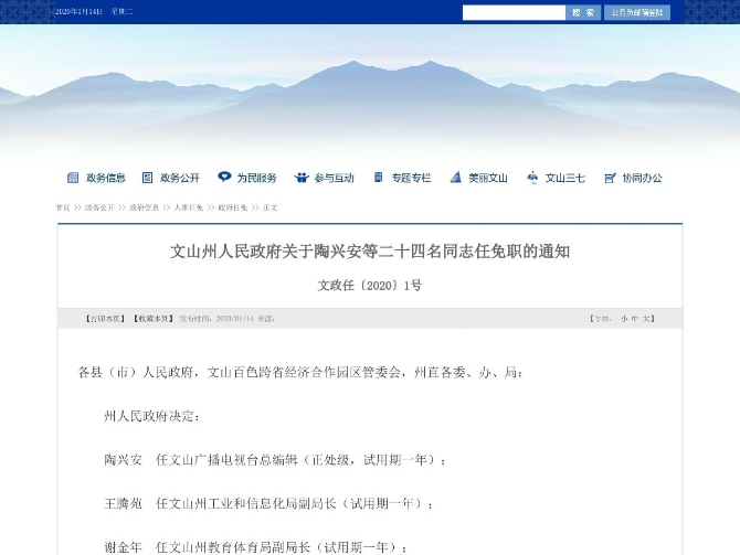 昆明信息港訊 機(jī)器人小明 1月13日,文山州人民政府發(fā)布了24名干部任免職的通知。詳情如下: