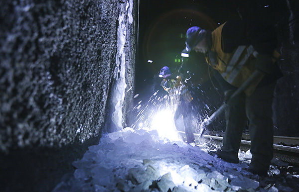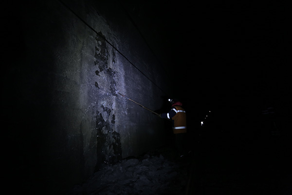西羅奇工隊(duì)鐵路工清理隧道內(nèi)冰掛。
